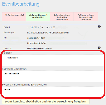 2.) Die Patientendaten, die Infos der Leitstelle und jene des Telefonartes sind hier schon fertig hinterlegt. Sie müssen nur mehr die Diagnose, die getroffenen Maßnahmen und etwaige Besonderheiten ergänzen.
