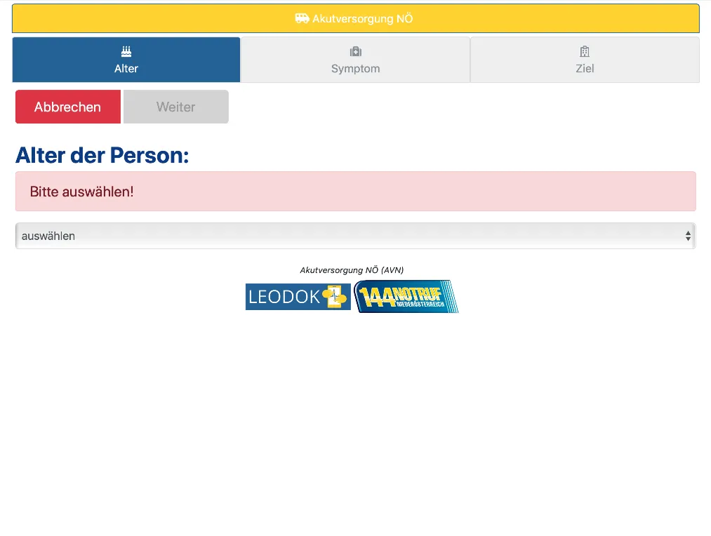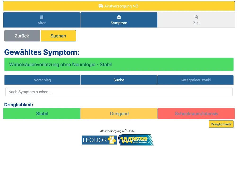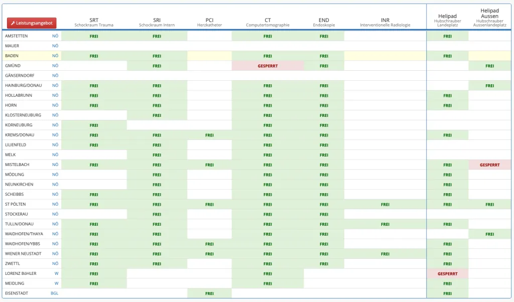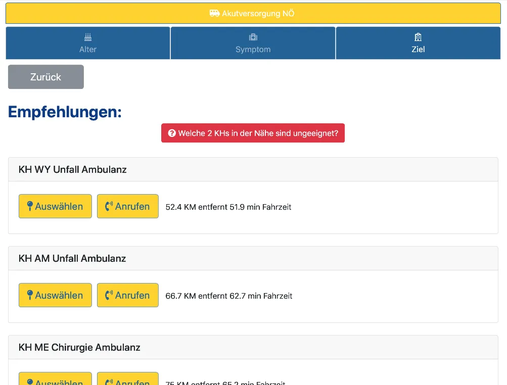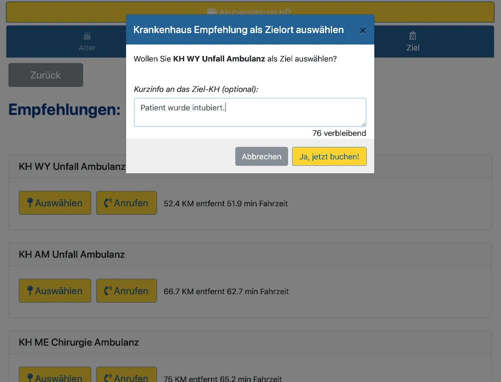 Der NÖ Akutversorgungsnachweis kann aufgrund der eingegebenen Daten und der hinterlegten Kapazitäten einen qualifizierten Vorschlag der nächstgelegenen, geeigneten Krankenhäuser erstellen. Trotzdem ist die Fahrzeugmannschaft bzw. der Notarzt IMMER für die entscheidende Auswahl des Ziel-Krankenhauses verantwortlich.