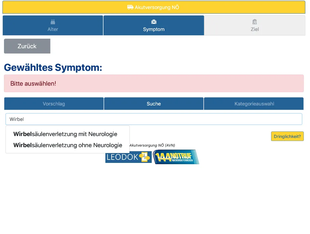 Die Symptome sind nur soweit im Detail ausgeprägt, als eine korrekte Klinikempfehlung möglich ist und ersetzt daher auch nicht eine möglicherweise genauere rettungsdienstliche oder notärztliche „Verdachtsdiagnose“.
