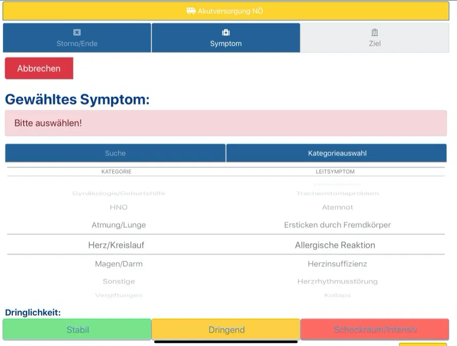 Nach welchen Kriterien erfolgt die Auswahl „stabil“, „dringend“ oder „Schockraum/Intensiv“?