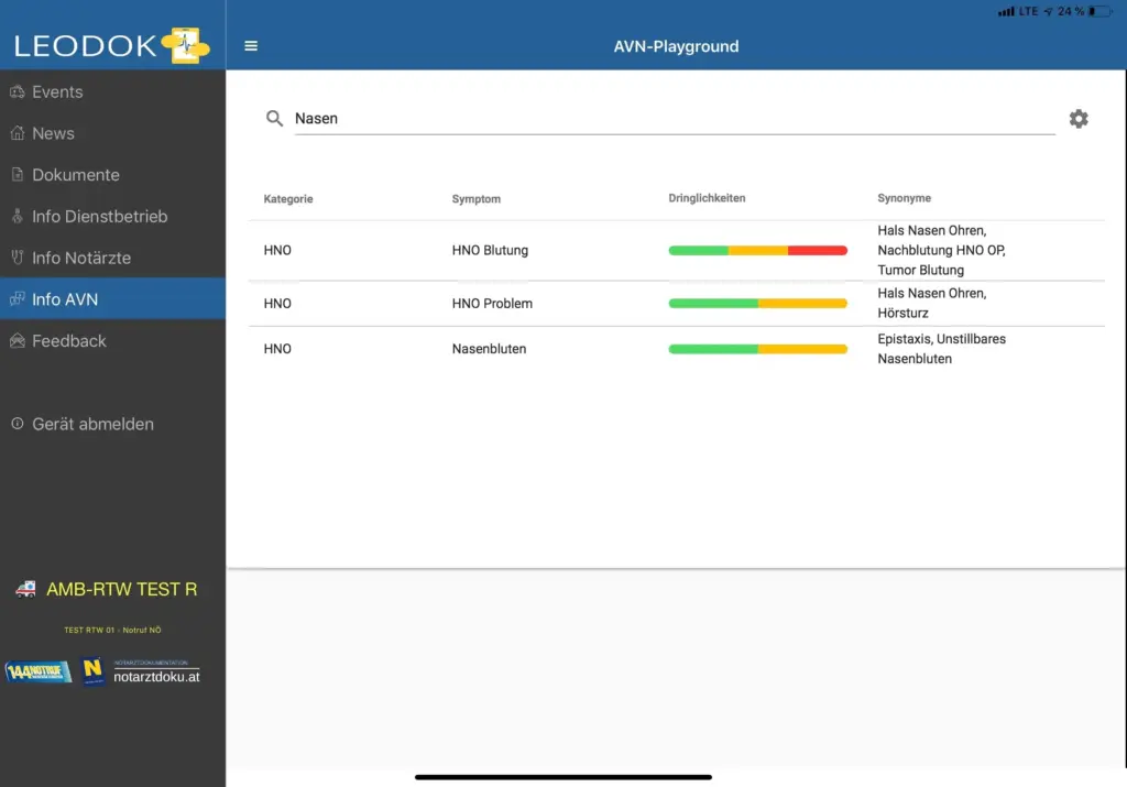 Am Dokumentations-iPad steht unter dem Menüpunkt „Info-AVN“ der „AVN-Playground“, eine praktische „Spiel- und Übungswiese“ des AVN zur Verfügung. Mit diesem Tool kann man – von einem Einsatz unabhängig – Zielortabfragen simulieren und so das System und die Vorschläge besser kennenlernen.