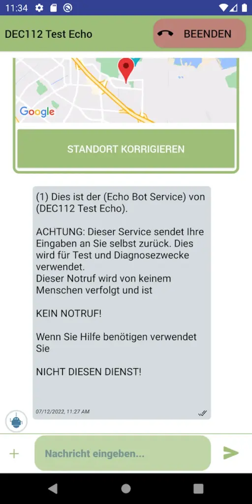 Die DEC112 App bietet textbasierten Zugang zu Leitstellen (Feuerwehr, Polizei, Rettung, Bergrettung) in Österreich. Bei Aktivierung wird der aktuelle Standort ermittelt, anhand dessen die örtlich zuständige Leitstelle bestimmt wird.