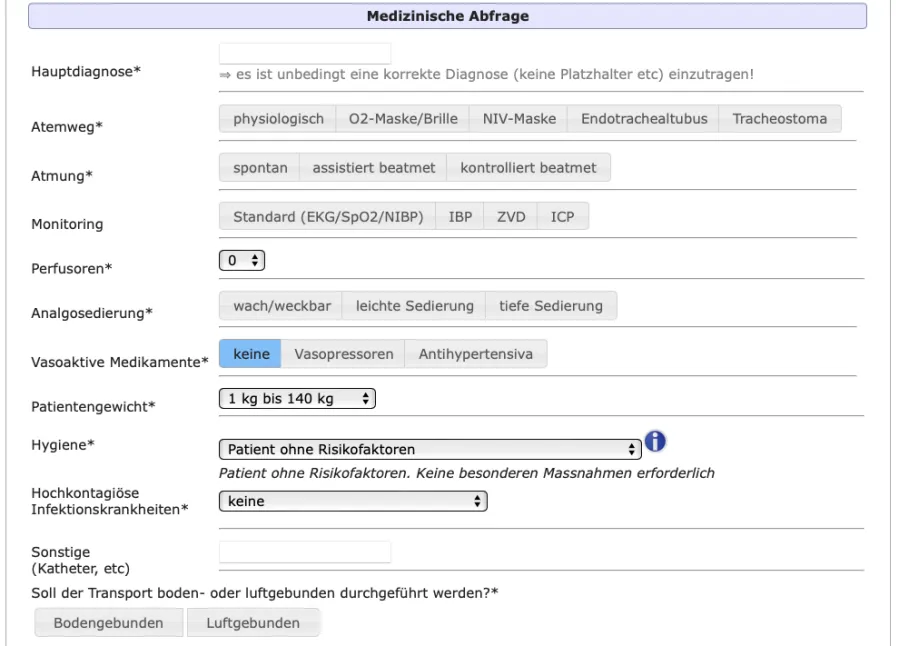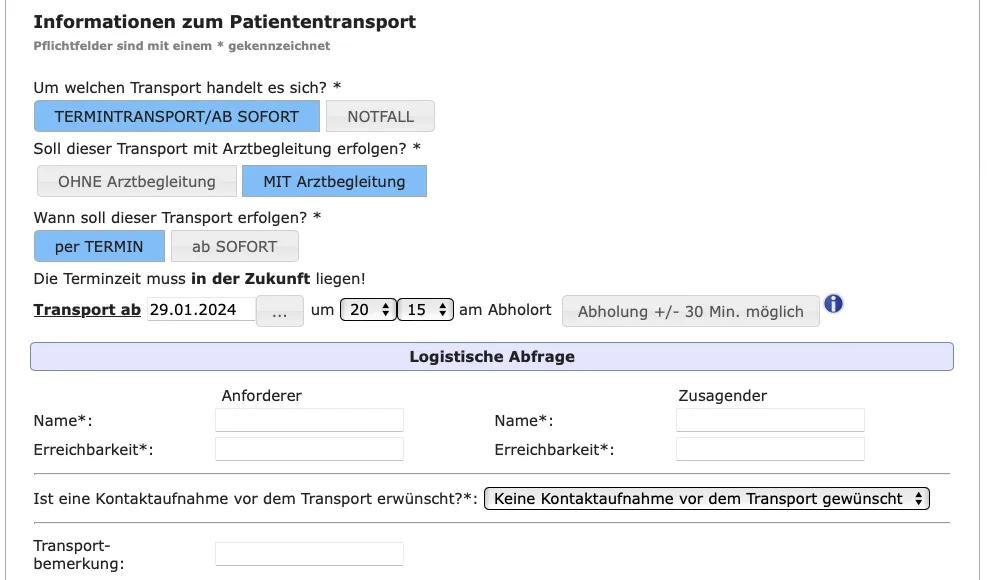 Voraussetzung für die Anforderung eines Sekundärtransports, ist das Vorhandensein der Zusage in der Zielklinik.