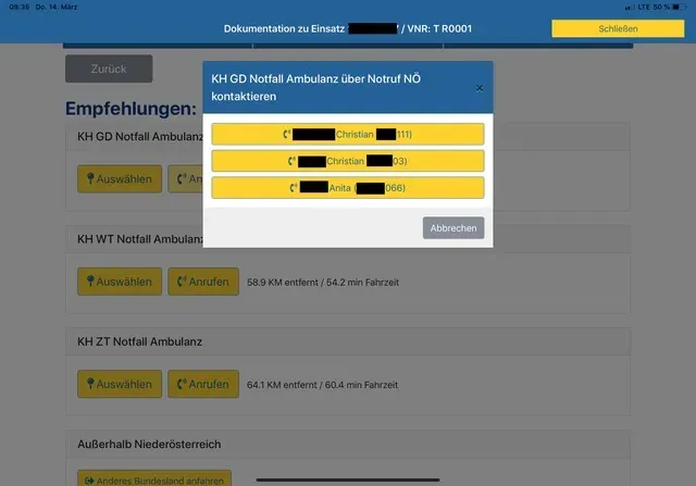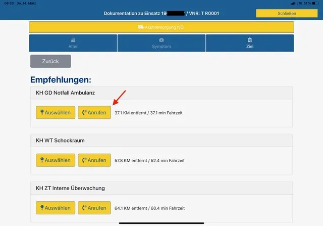 Um eine direkte Anmeldung von kritischen Patienten bzw. ein direktes Arzt zu Arzt Gespräch optimal zu unterstützen, wird bei der Zielortauswahl zusätzlich zur Klinikauswahl auch der Button „Anrufen“ angezeigt. Ein Klicken auf diesen Button stellt eine direkte Verbindung mit dem im Krankenhaus für diese Symptomatik verantwortlichen und von der Klinik bekannt gegebenen Mitarbeiter her, in der Regel Arzt /Ärztin oder Pflegeperson.