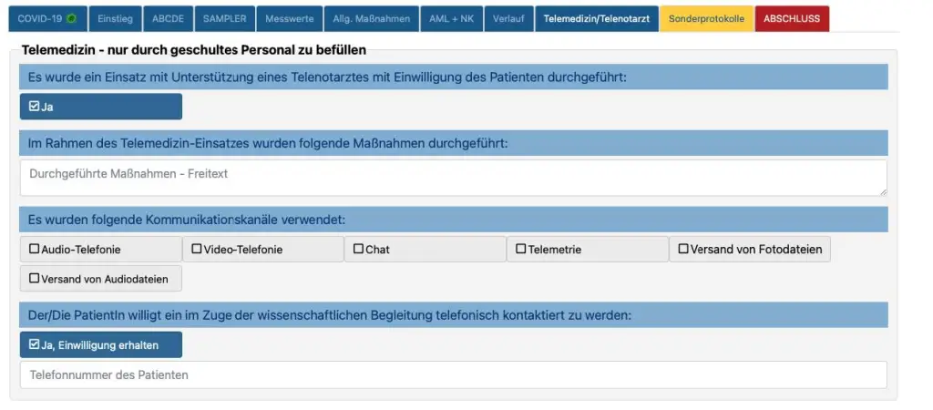 Ein neues Sonderprotokoll „Telemedizin/Telenotarzt“ wurde hinzugefügt. Dieses ist bitte ausschließlich durch am RK-Pilotprojekt teilnehmende Dienststellen – bei bzw. nach der Anwendung der telemedizinischen Applikationen – auszufüllen. Die jeweiligen RK-Dienststellen wissen Bescheid …