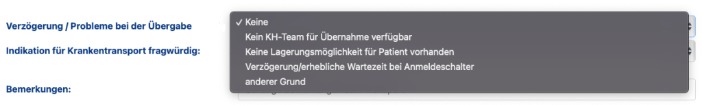 Es geht um die Auswahlfelder „Verzögerung/Probleme bei der Übergabe“ und „Indikation für KT fragwürdig“, die nun nicht mehr standardmäßig bereits mit einem Wert vorbelegt sind, sondern aktiv ausgewählt werden müssen.