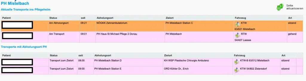 - Hier sieht man alle vorgemerkten Transporte aus dem Pflegeheim und Überstellungstransporte in eine andere Einrichtung angezeigt.