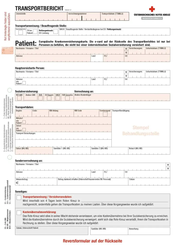 Man kommt zu einer Auswahl der Transportart und springt automatisch zur Kostenübernahmeerklärung
