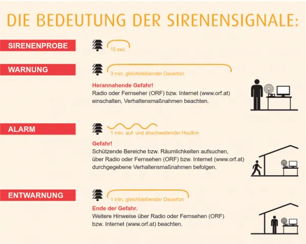 Über die Bundeswarnzentrale, die Landeswarnzentralen sowie etliche Bezirksalarmzentralen können ferngesteuert die Sirenensignale ausgelöst und damit die Bevölkerung gewarnt und die Einsatzkräfte alarmiert werden. Da durch diese Signale nicht auf die Art der Gefahr und die richtigen Verhaltensmaßnahmen hingewiesen werden kann, müssen im Ernstfall nähere Informationen und Verhaltensregeln laufend durch den ORF durchgegeben werden.