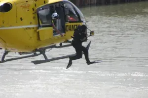 2. Der Taucher wird in voller Montur (Anzug, Flossen und Luft für 10 Minuten) an Bord genommen und kann somit ohne Zwischenlandung direkt beim Verunfallten (sobald dieser lokalisiert ist) aus dem schwebenden Hubschrauber aussteigen.
