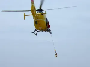 5. Durch das Anheben des Hubschraubers spannt sich das Seil zwischen Hubschrauber und Rettungsring und bewirkt ein Zusammenziehen des Rings. Somit ist der Verunfallte fixiert und kann vom Helikopter an der Wasseroberfläche ans rettende Ufer geschleppt werden.