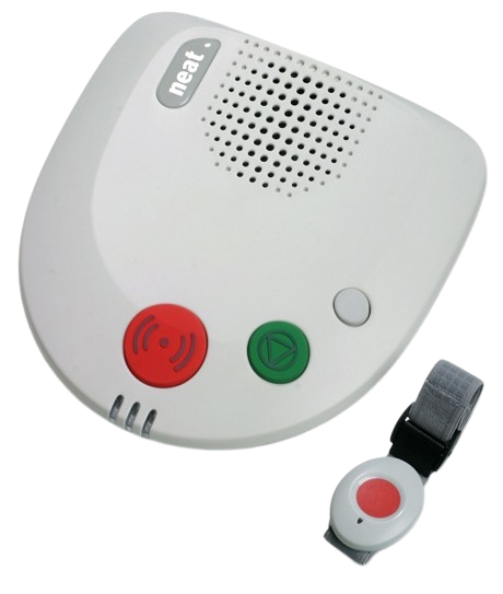 Ein Notruftelefon besteht aus einem an das Telefonnetz angeschlossene Basisgerät und einem Alarmsender.